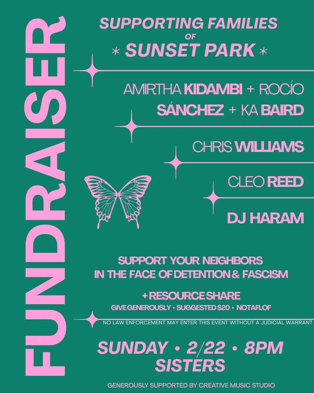 The same goes for NYC as we see a rise in ICE presence throughout the 5 boroughs. My dear comrade Laura Cocks and I are organizing a fundraiser to benefit neighbors in Sunset Park and South Brooklyn, who have been impacted by ICE detention, this Sunday 2/22 at Sister’s in Brooklyn with Chris Williams solo, a trio set with me, Ka Baird and a very special guest on cello, and the magical Cleo Reed, with DJ Haram in the booth and resource sharing around community defense throughout the evening!